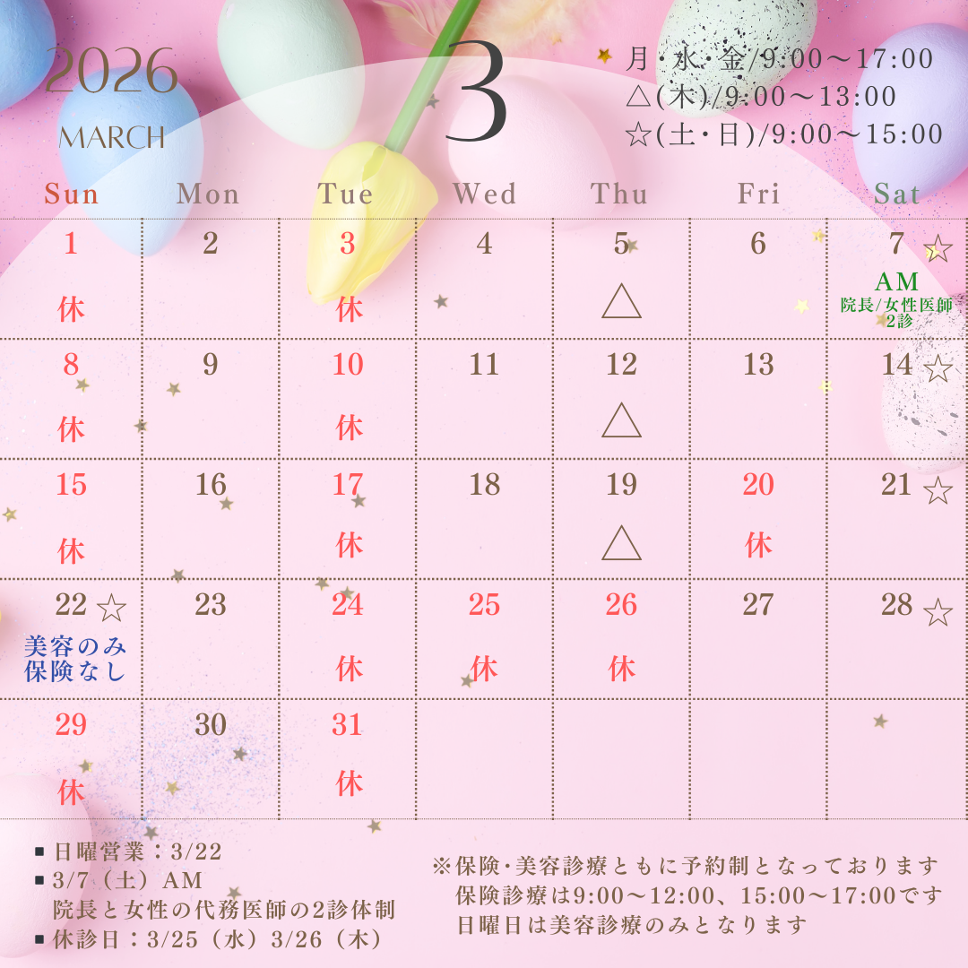 また、ニキビに対して効果のある成分としては、ピーリング系の成分(マンデル酸、乳酸、サリチル酸、グリコール酸)レチノール(ビタミンA)、ビタミンC、アゼライン酸などがあげられます。当院ではドクターズコスメを豊富に取り揃えておりますので、患者さんのお肌状態に合わせて適したスキンケア用品もご提案させていただきます。
